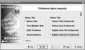 Gelen ekranda SETUP TİPİ’nde demo seti ve DEMO TİPİ’nden de eğitim seti (tek kullanıcılı) veya eğitim seti (çok kullanıcılı) seçildikten sonra tekrar "İleri" seçeneğini seçilir.