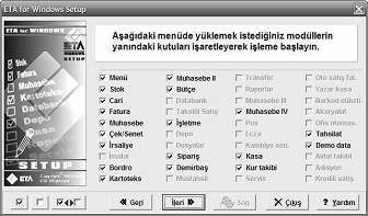 Sonraki ekran yanda görülen menü belirleme ekranıdır. Bu ekranda, paket programda çalışılacak menüler belirlenir ve "İleri" seçeneği ile kuruluma devam edilir.
