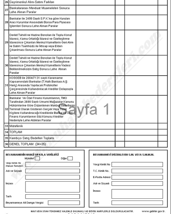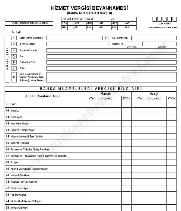 Hizmet vergisi beyannamesi - Banka muameleleri vergisi (Excel)
